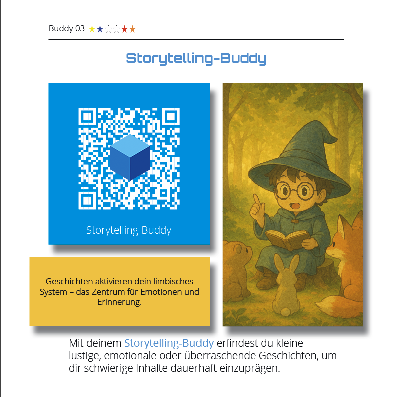 Mit deinem Storytelling-Buddy lernst du mit Hilfe von künstlicher Intelligenz, Lerninhalte in kleine, emotionale Geschichten zu verwandeln.